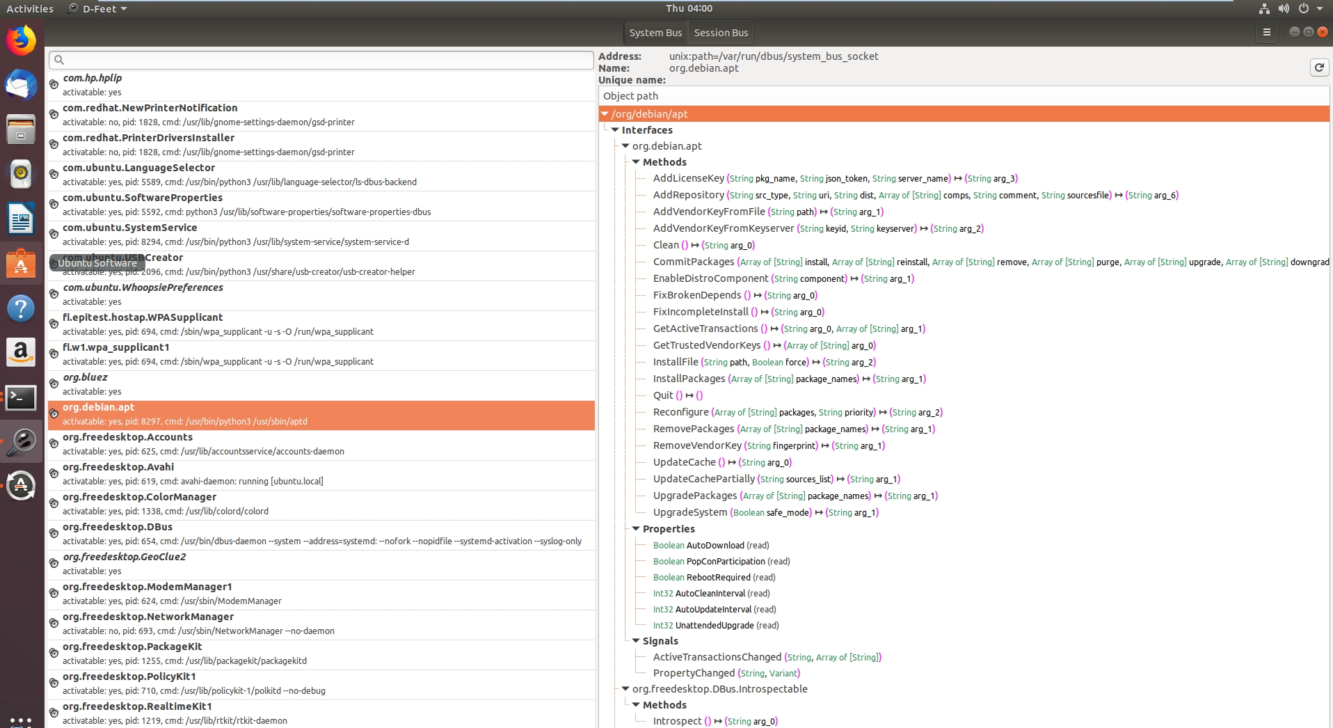 In the first image services registered with the D-Bus system bus are shown, with org.debin.apt specifically highlighted after selecting the System Bus button. D-Feet queries this service for objects, displaying interfaces, methods, properties, and signals for chosen objects, seen in the second image. Each method's signature is also detailed.