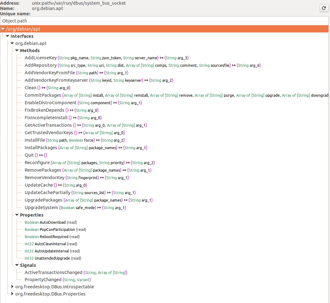 For communication with the D-Bus interface, two tools were employed: a CLI tool named gdbus for easy invocation of methods exposed by D-Bus in scripts, and D-Feet, a Python-based GUI tool designed to enumerate the services available on each bus and to display the objects contained within each service.