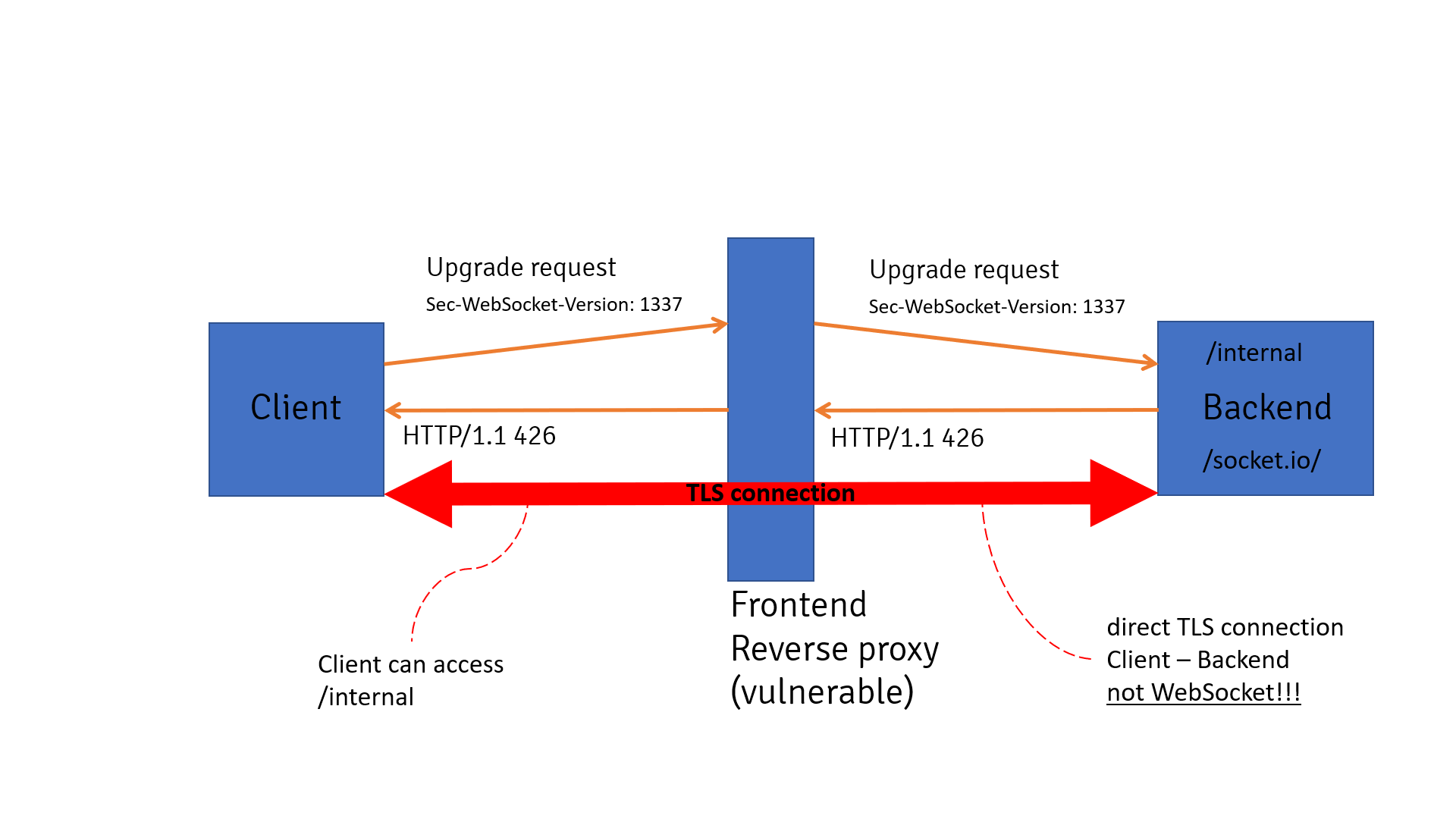 426, indicating the incorrect protocol version in theSec-WebSocket-Versionheader. The reverse proxy, overlooking the backend's response status, assumes readiness for WebSocket communication and relays the response to the client.Consequently, the reverse proxy is misled into believing a WebSocket connection has been established between the client and backend, while in reality, the backend had rejected the Upgrade request. Despite this, the proxy maintains an open TCP or TLS connection between the client and backend, allowing the client unrestricted access to the private REST API through this connection.