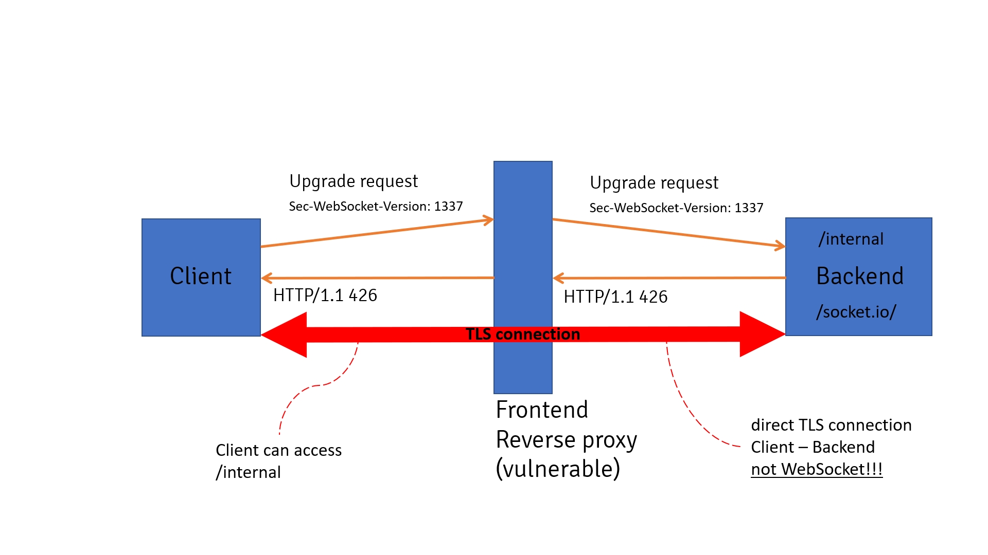 Sec-WebSocket-Versionprotocol version in the header. The proxy, failing to validate theSec-WebSocket-Versionheader, believes the Upgrade request to be valid and forwards it to the backend.The backend responds with a status code